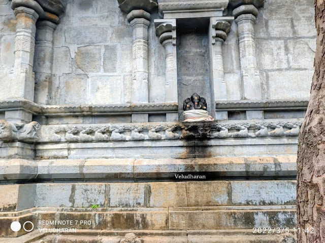 The Mukha mandapam can be accessed from both sides with 7 steps. The Sanctum sanctorum is on the lower level. Since Lover level is not visible ( filled with construction ) and upper level Jagathi is only Visible.The upper level is on a pratibandha adhistanam with padma jagathy, vrutha kumudam and Viyyalavari. The Bhitti starts with vedigai. The Bhitti and vimanam above vedigai was constructed with brick.