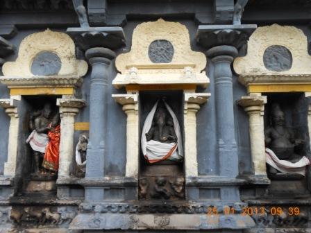 In Praharam Vikrama Chozha Vinayagar / Nethra Vinayagar, who gave eye sight to the King under Gajabrushta vimanam, Sri Valli Devasena Subramaniyar, Navagrahas, Saniswarar ( is in separate sannidhi between Shiva and Ambal Sannidhis ), Suryan, Bairavar, Chandikeswarar, 63var,. Ambal is in a separate sannidhi in standing posture facing South with abhaya varada hastam.